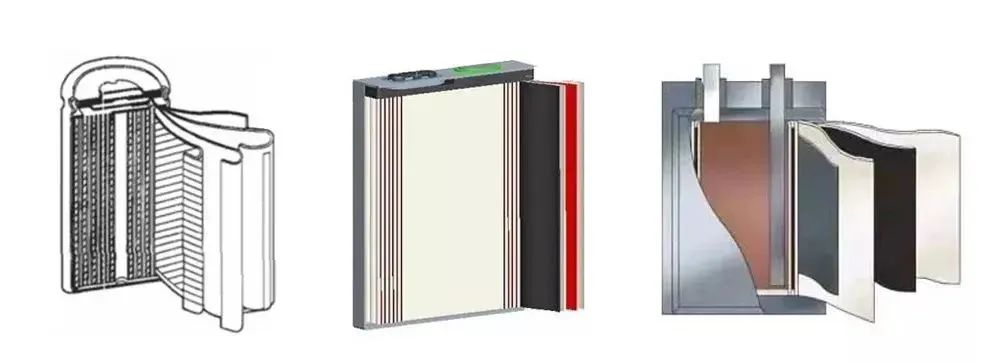 左-圆形锂电池 中-方壳锂电池 右-硬包锂电池