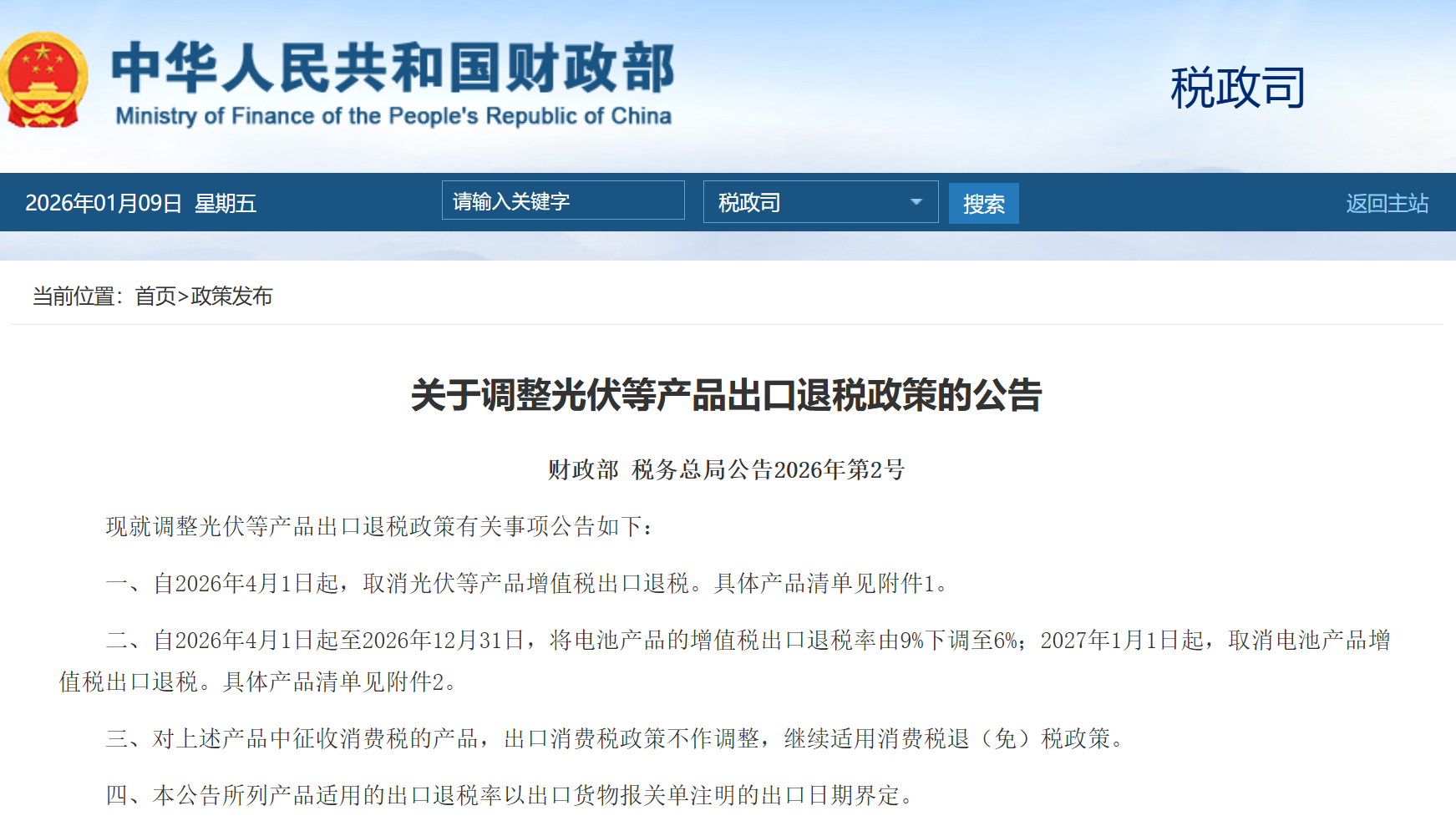 导读:1月9日,财务部、税务总局宣布对于调剂光伏等产物出口退税政策的告诉布告:自2026年4月1日起,打消光伏等产物增值税出口退税。自2026年4月1日起至2026年12月31日,将电池产物的增值税出口退税率由9%下调至6%;2027年1月1日起,打消电池产物增值税出口退税。